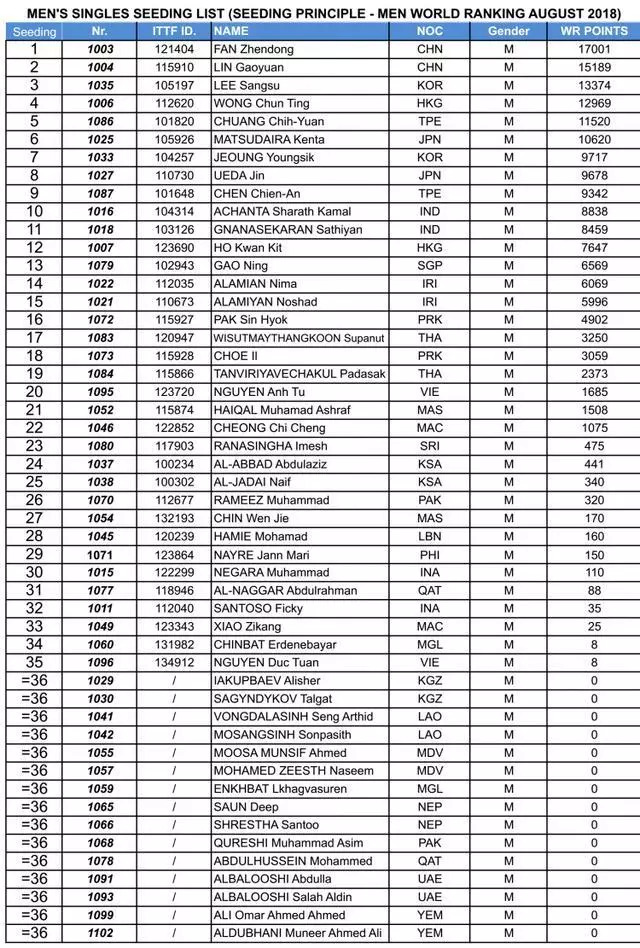 2018雅加达亚运会乒乓球比赛将于8月26日至9月1日进行。中国男队由樊振东、林高远、王楚钦、梁靖崑、薛飞出战。女队派出朱雨玲、陈梦、王曼昱、陈幸同、孙颖莎参赛。目前,种子名单已经出炉,中国队占据所有项目,即男女团体、男女单打和混双的一号种子。