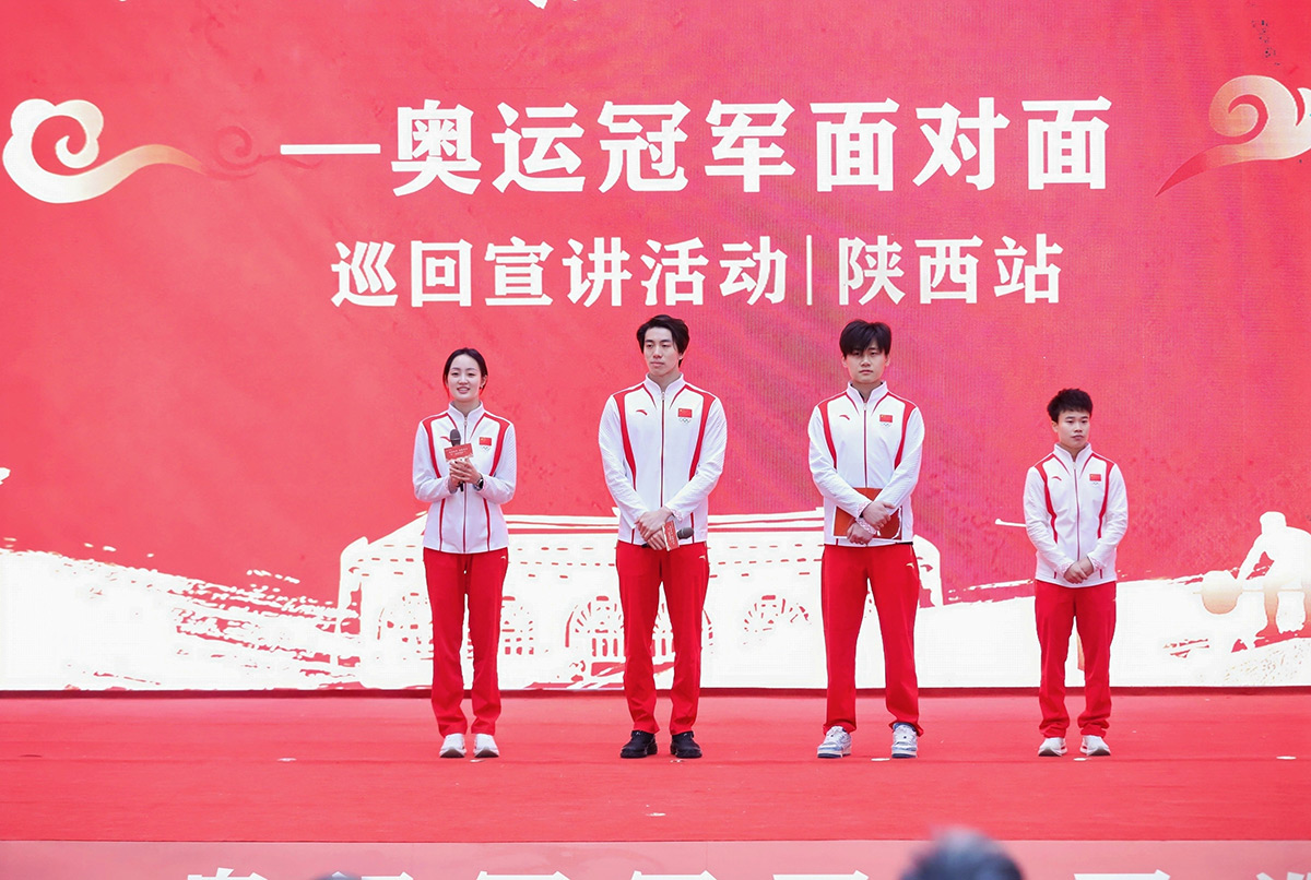 当天下午,奥运健儿们来到延安1938街区,这里通过对老延安城建筑细节和文化内涵的捕捉,给游客们还原了一个生动的“老延安”。老城延安,红色记忆,巴黎奥运会男子4×100米混合泳接力冠军孙佳俊和巴黎奥运会花样游泳集体技巧自选比赛冠军肖雁宁在这里与现场观众分享了自己的奥运记忆。