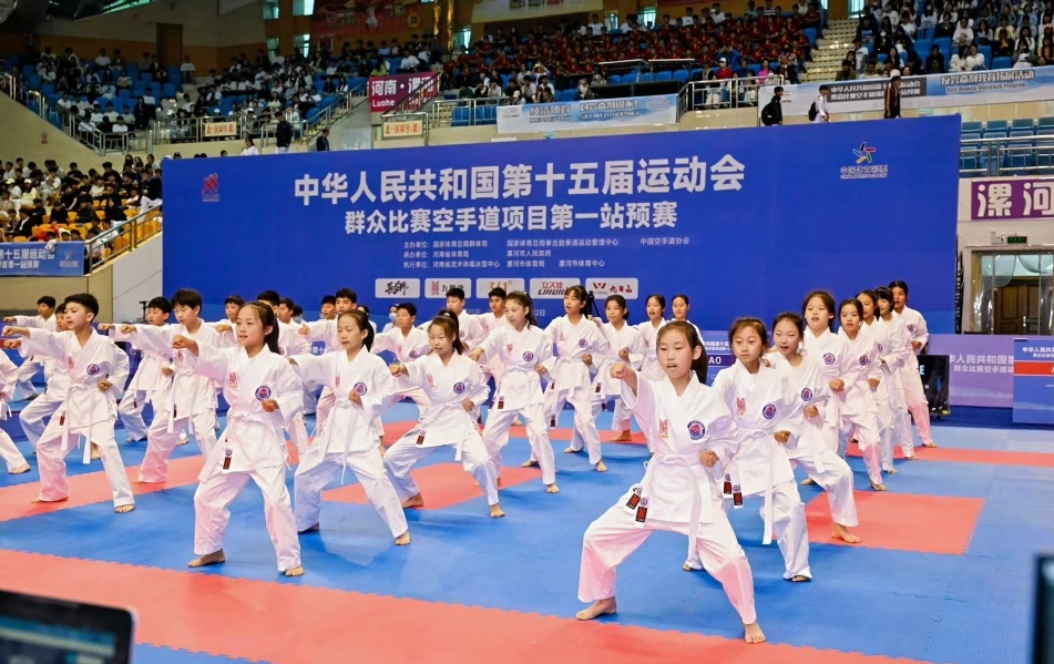 5月10日的河南漯河体育馆人声鼎沸、热闹非凡,十五运会群众比赛空手道项目第一站预赛在此拉开序幕,100名身着空手道道服的五年级学生在开幕式上表演的《动天》,不仅营造出了“全民全运”的热烈氛围,更彰显了体教融合的成果。
